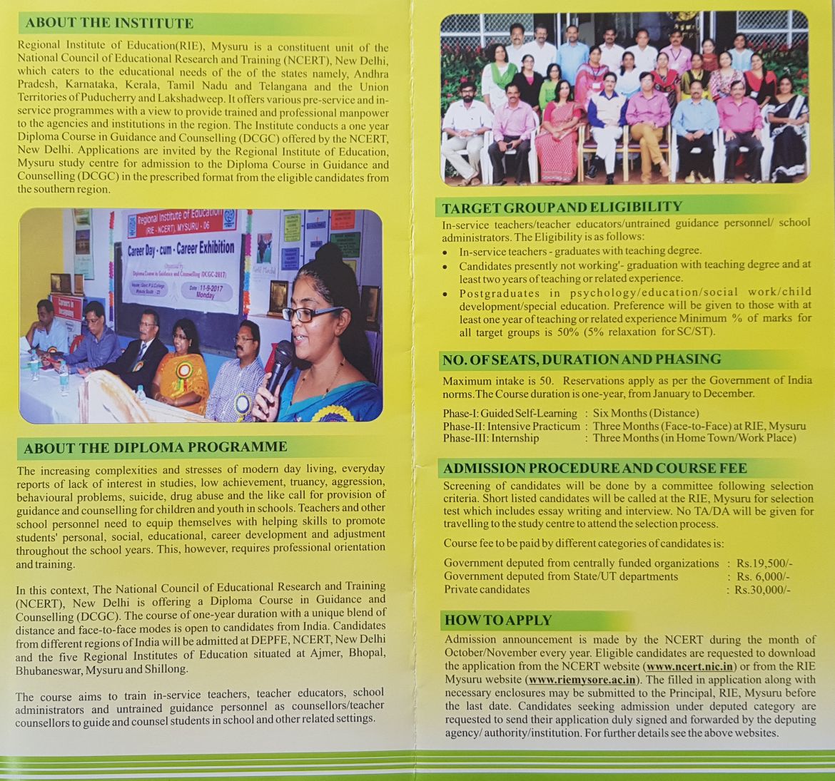 Diploma Course in Guidance and Counselling is offered by National Council of Educational Research and Training(NCERT), New Delhi. This course is offered at the Department of Educational Psychology and Foundations of Education (DEPFE), NCERT New Delhi as well as five Regional Institutes of Education located at Bhopal, Mysuru, Shillong, Bhubaneswar and Ajmeer.